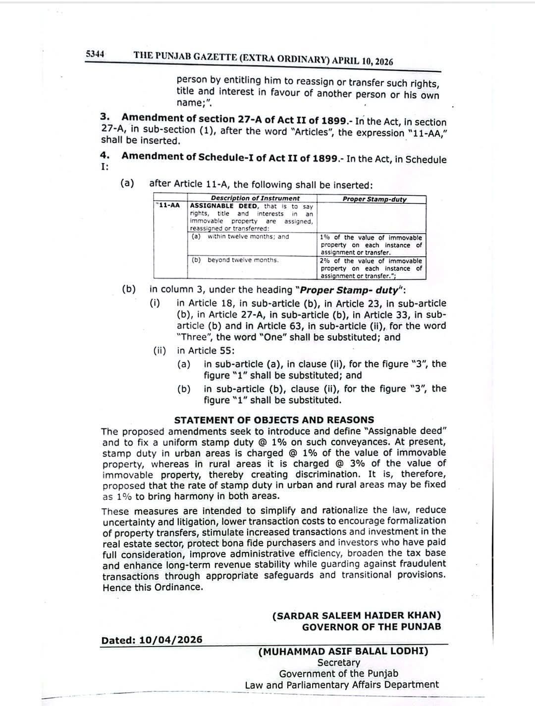 حکومت پنجاب نے Stamp (Amendment) Ordinance 2026 جاری کر دیا ہے جس کا مقصد پراپرٹی ٹرانزیکشنز کو آسان اور سستا بنانا ہے۔